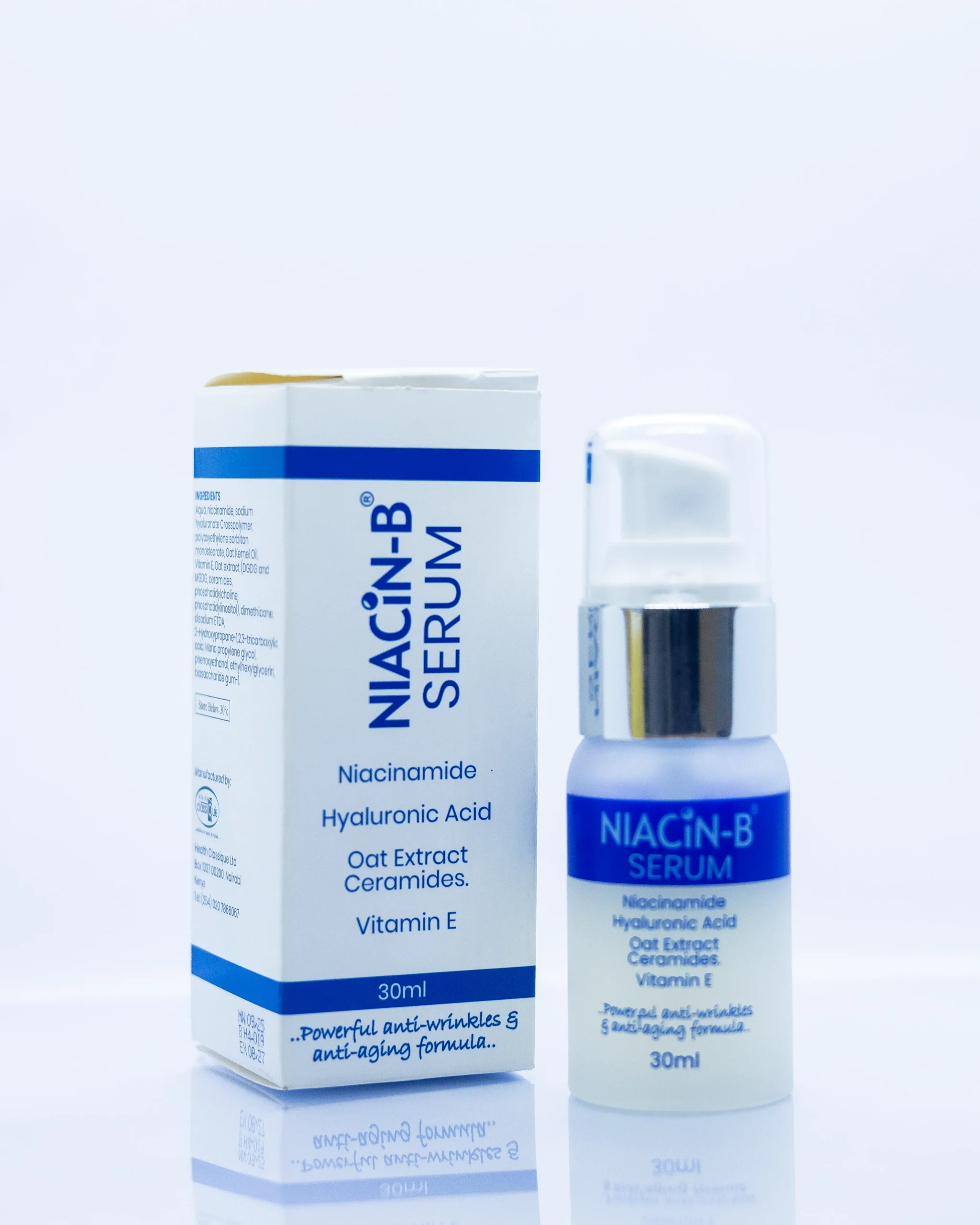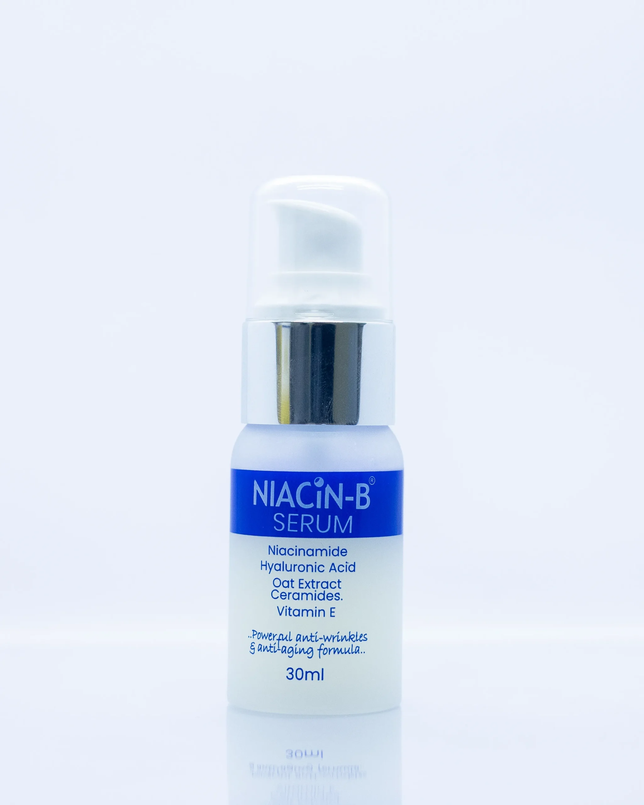 NIACIN-B SERUM is a combination of powerful Anti aging and skin protecting ingredients that include Hyaluronic acid,Niacinamide,Oats Extract Ceramide and Vitamin E;to Hydrate,Repair, Renew and protect the skin’s lipid barrier-helping to prevent and manage the signs of skin ageing.